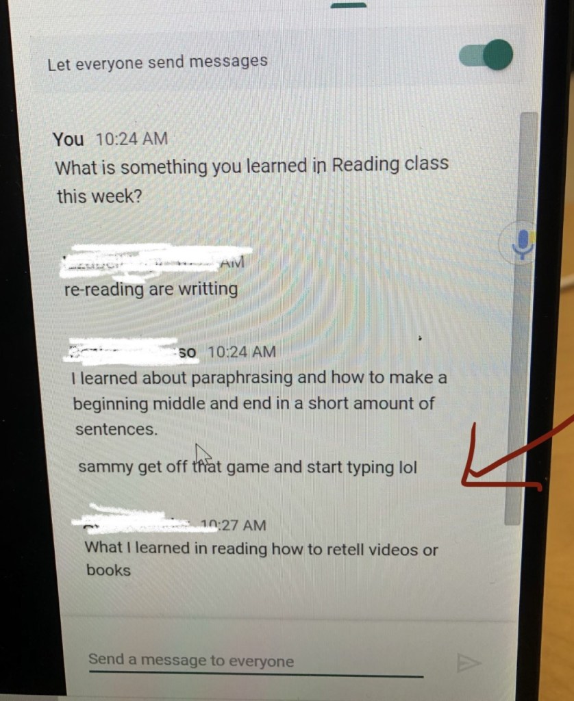 Use the Chat and Keep Meet On: Use the chat feature to engage & empower learners throughout the time you are logged in. Ask them questions (i.e. How’s your day going? What is something you learned today? What questions do you have?). Learners also keep each other accountable during instruction! Keep Meet on during independent practice. Learners feel supported when they know you are there and they can pop back in with questions.