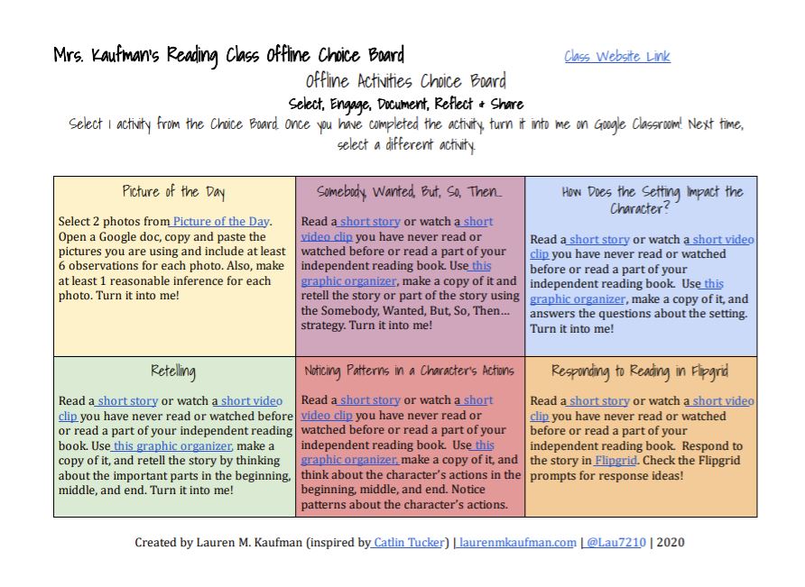 Whether in physical or virtual spaces, learners will need access to print and digital texts to read in order to deliberately apply the skills and strategies that were explicitly taught during the minilesson. Book access, voice, and choice are more vital than ever before. Learners can do the thinking work by reading a short story, watching a short video clip, and/or reading their independent reading book; they will need whatever it takes to empower and engage them in the process. Students have to feel like they are owning their learning! Once learners make a plan for their independent reading and have an understanding of what goals they are working towards, they will independently read in both spaces. If learners are in the physical space, they will read at their socially distant desks; if working synchronously, virtual learners will be placed into an individual breakout room to independently read. Additionally, teachers may decide to place readers in partnerships to support and guide one another’s reading and thinking work. Here’s the bottom line, since the 1980’s there has been a substantial amount of research that the only way students get better at reading is READING! Also, you may consider embedding “catch up” days when there are no new minilessons taught. These days, will give learners an opportunity to revisit and apply a multitude of skills and strategies they have previously learned during independent reading time. These days will also allow the teacher to catch up on small group instruction and 1:1 conferencing. Providing learners with choice and voice about how they can show their thinking during this time will empower them to take ownership over the experience! Check out this Offline Choice Board inspired by Catlin Tucker that may be utilized during this time.