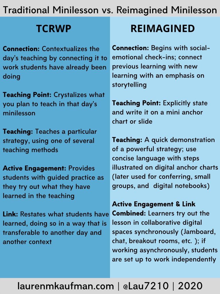 Although the content of a minilesson will change almost daily, the structure will remain the same. The framework of a minilesson is predictable and usually is completed in 10 minutes or so. If educators are able to master the architecture of the minilesson, learners will know what to expect in both physical and virtual spaces. For the current educational landscape, it is important to consider putting a special emphasis on the “Connection” component of the minilesson. It is going to be worth the investment of time to “hook” learners into the lesson with passion and purpose. Look into those small moments of your life and share those stories with students. In a recent Future Ready virtual conference, Brianna Hodges reminded educators that “The shortest distance between a human being and the truth is a story. With stories, we find a connection to people and then they have a reason to care. According to A Guide to Reading Workshop: Middle School Grades by Calkins & Ehrenworth (2017), the traditional components of a minilesson can be found on the left side of the chart below. On the right side, the minilesson has been reimagined for new physical and virtual spaces. Many of these ideas overlap.