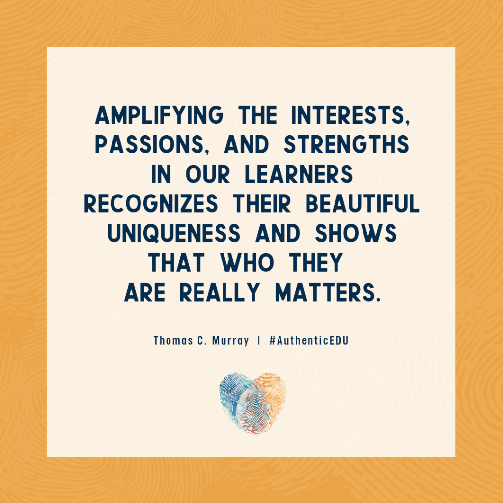 In order to make a difference in the lives of our learners, great educators must create experiences that tap into learners’ hearts so their minds are open to critically consuming information to create new and better things that are relevant to them and the real world. Meaningful learning sticks when great educators focus on the right things first! In Innovate Inside the Box, George Couros says, “We have to acknowledge that our students come to us with a unique mix of experiences, strengths, weaknesses, and passions…Our calling or task is to expose students to numerous pathways and provide them with the skills to be self-directed and goal-oriented so they can choose or create a path that allows their brilliance to shine” (p.32). I’ll admit, at the beginning of my career, I was so focused on delivering the curriculum that I rarely leveraged the moments where I could have listened more and developed deeper connections with my students to make learning matter. I always cared about them, but I thought that the primary way of showing it was by “covering the content” instead of making investments in their emotional deposit boxes and continuously giving them the choice and voice they deserved. In the book Personal and Authentic, Thomas Murray says, “Expecting children to walk through our doors and desire a “standard” model of education completely ignores the vast differences in interests, passions, and strengths of our learners. Providing opportunities, both small and large for these learners to explore areas that are meaningful to them recognizes who they are and reaffirms to them that they matter” (p. 107).