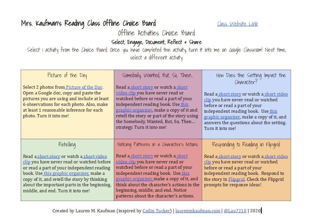 Choice boards are not only a great way to empower learners by giving them choice and voice in what and how they are going to learn, but it also provides meaningful balance between online and offline learning. I have found that providing learners with choice boards encourages intrinsic motivation and a more meaningful desire to learn, personalized instruction, and allows students to respond by using various print and digital competencies. This type of freedom guides learners towards independence. The choice boards I designed below were inspired by Catlin Tucker’s blog and self-paced course on blended learning. Each choice board includes skills/strategies that I have introduced in my own classroom. I revise the learning activities as I introduce new skills/strategies. Revising the options keeps learning fun and engaging! In the book Innovate Inside the Box, Couros states, “When students are empowered to choose how they can best demonstrate their knowledge and skills, they are able to see the relevance in learning the basics and how reading, writing, and math apply to their lives and are less likely to check out mentally” (pp. 62-63).