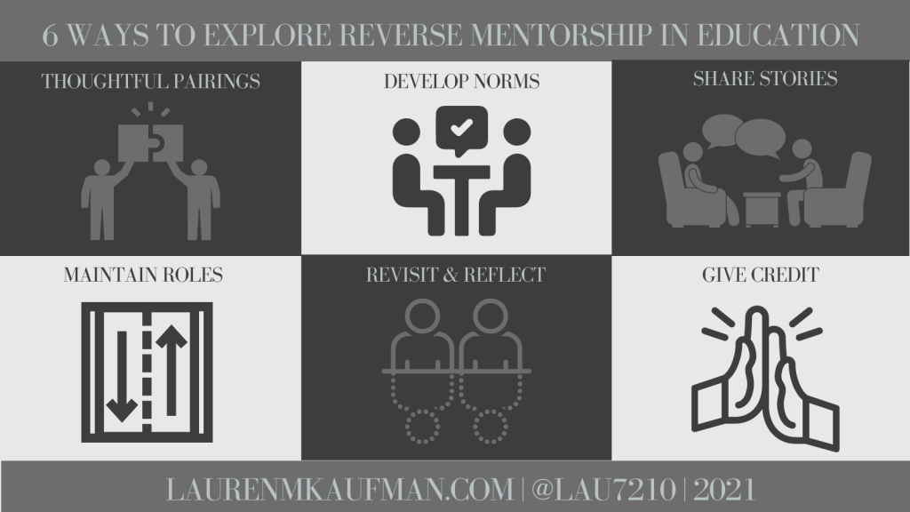 *Before exploring the Reverse Mentorship experience, it will be important to meet with your mentor/mentee pairs to explain what Reverse Mentorship is and why it can be valuable for the growth and development of educators within the organization. Having continuous follow-up meetings to reflect on the experience will be an important part of the process as you work to refine it over time so everyone involved can reach their maximum potential! Realistically, this pivot from the traditional mentorship approach may only take place in dedicated slots of time within the mentoring experience.