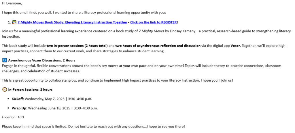 Then, send a warm, welcoming invitation that feels more like an opportunity than a task. Let people know this is a space for professional learning and inspiration where their voice matters and their presence will make the group stronger. When we create spaces like this, we’re laying the foundation for learning that lives beyond the book.
