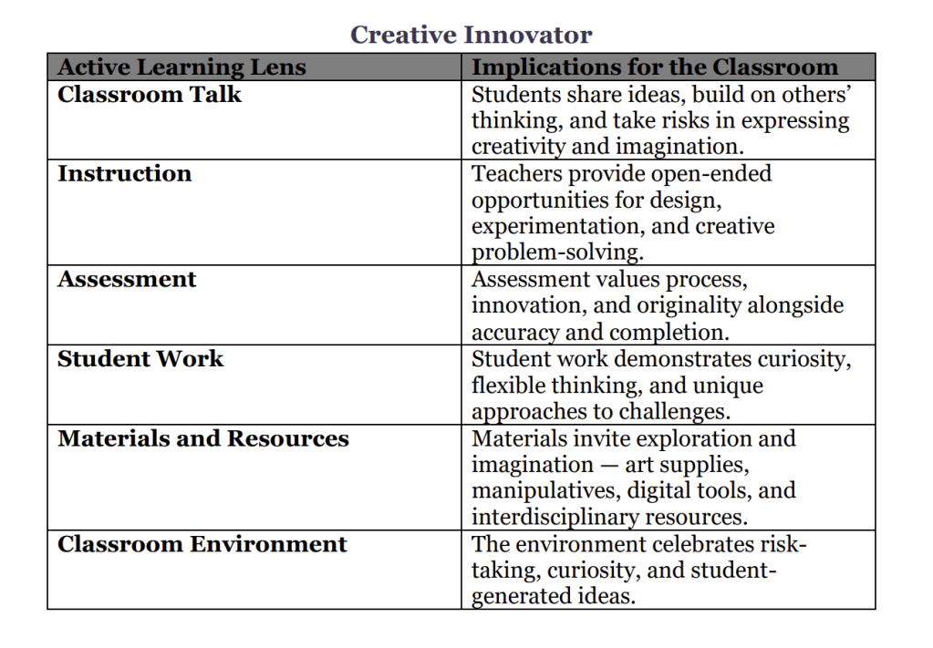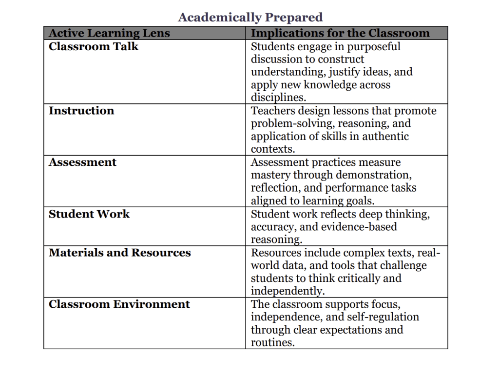 Below are two examples of how the six components for active learning connect to the Portrait of a Graduate attributes: Academically Prepared and Creative Innovator. These examples illustrate how active learning comes to life in classrooms and how leadership teams can use shared lenses to notice and nurture these practices.