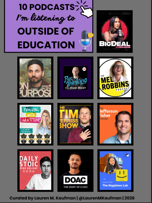 These days, many of the podcasts I go back to most don’t necessarily live in the education space. And yet, they continue to elevate my thinking in education. They challenge how I see people. They stretch my thinking about instruction, leadership, identity, purpose, resilience, creativity, and growth. They influence how I show up in rooms, how I listen, and how I make decisions.