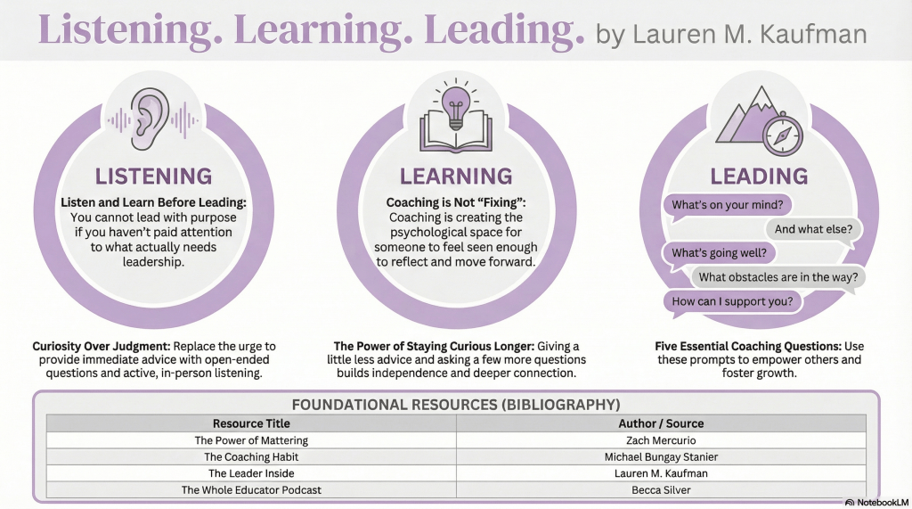 For me, this looks like a few simple reminders: pause before responding, ask one more question, and resist the urge to solve too quickly. Coaching doesn’t require more time. It requires more intention in the time we already have.